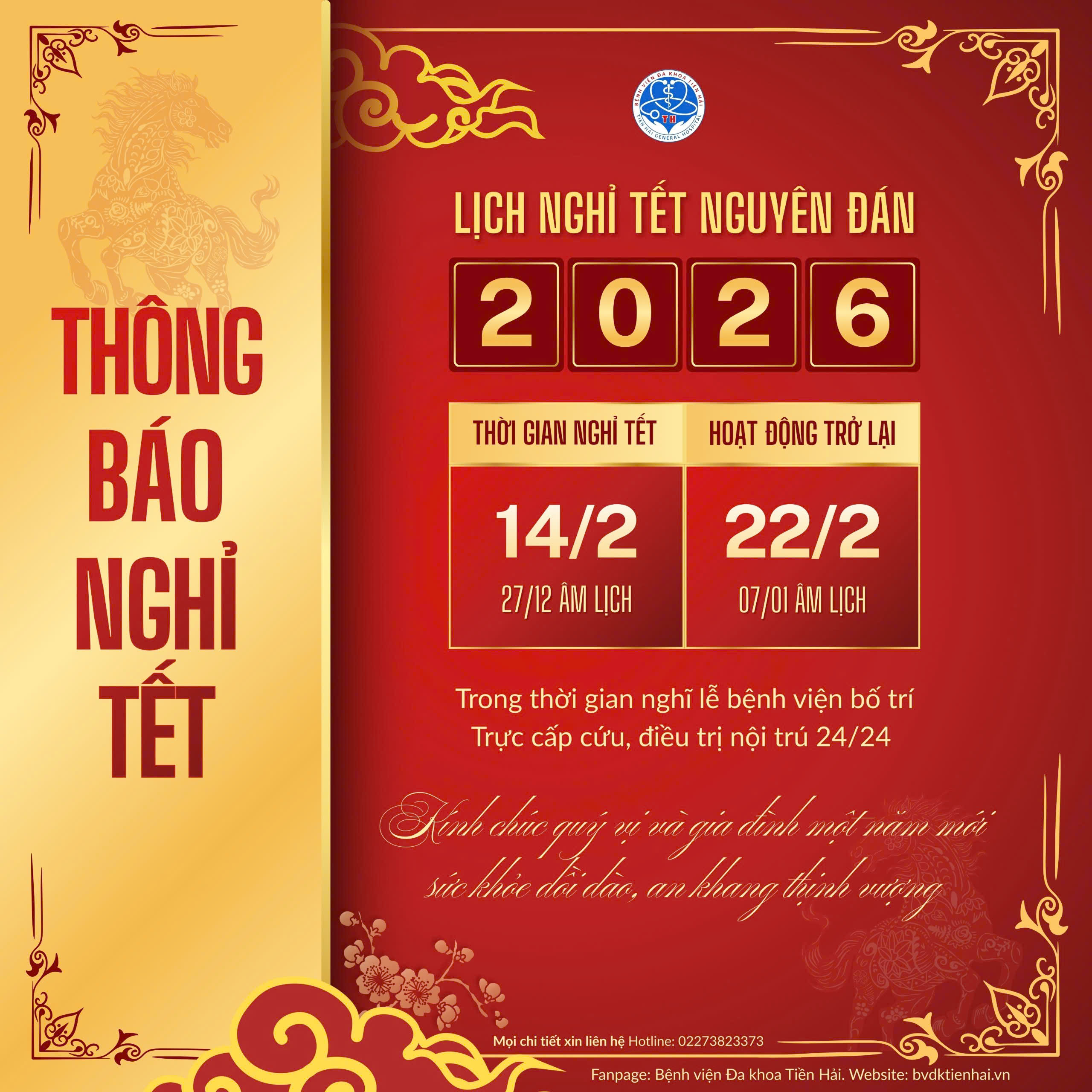 Bệnh viện Đa khoa Tiền Hải xin trân trọng thông báo lịch nghỉ Tết Nguyên đán xuân Bính Ngọ như sau: