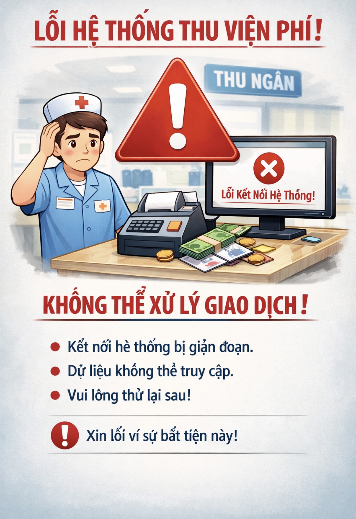 Do sự cố kỹ thuật của phần mềm quản lý viện phí, hoạt động thanh toán qua tài khoản ngân hàng tại bệnh viện hiện đang tạm thời bị gián đoạn.
